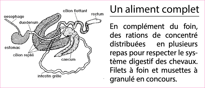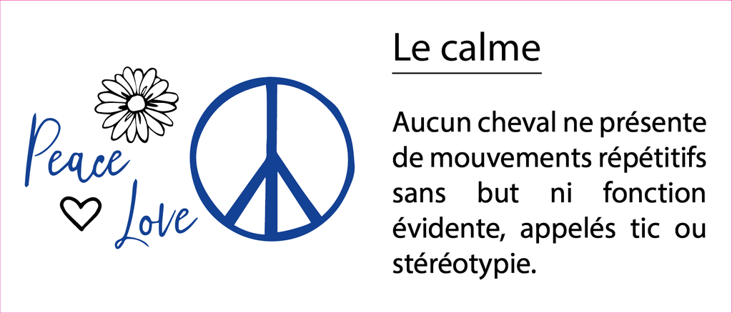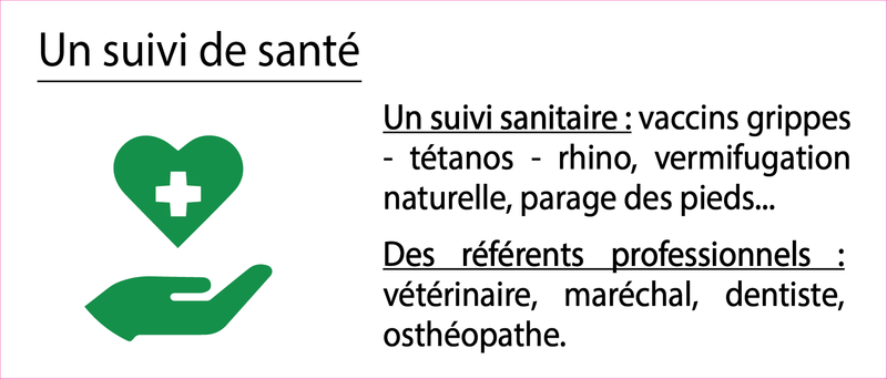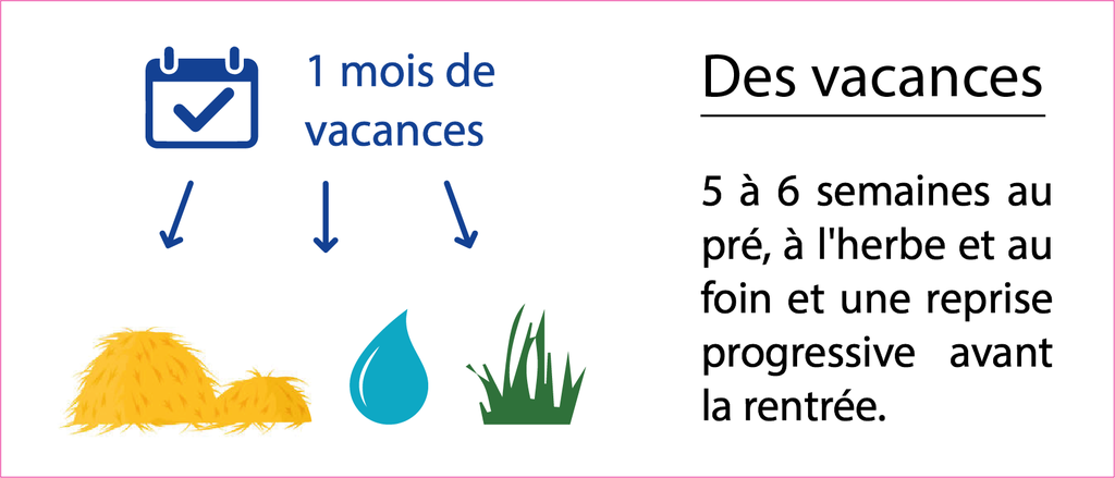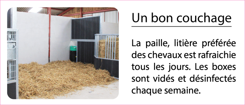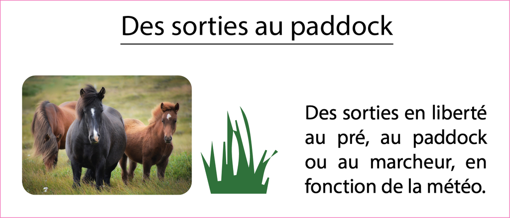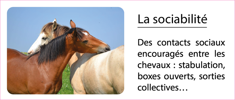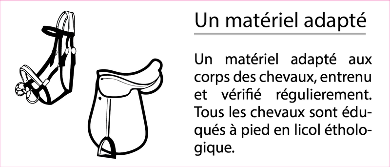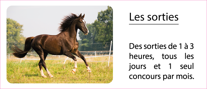 Nos chevaux sortent quotidiennement et bénéficient de contacts avec leurs congénères (de part l'aménagement des écuries). Ils ne travaillent pas plus de 8h par semaine et sont de repos le lundi et le mardi.